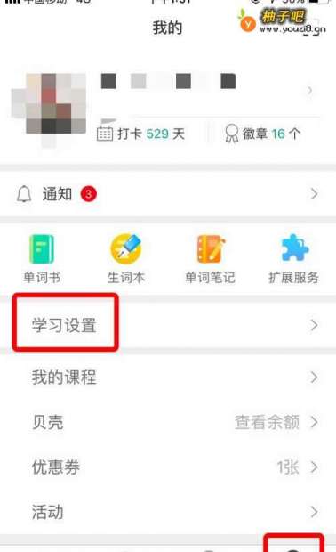 2进入扇贝单词英语版,点击“我的——学习设置”,如图所示。