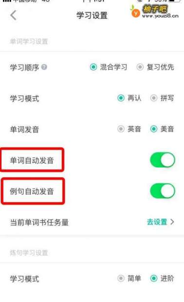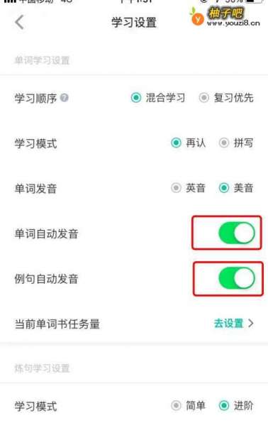 3点击进入“学习设置”后,能看到“单词自动发音”以及“例句自动发音”选项,如图所示。
