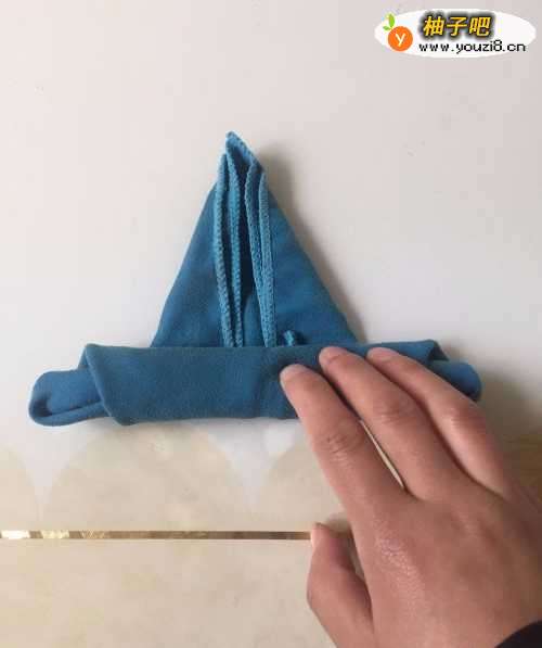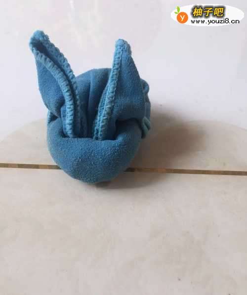 7将兔子的两个耳朵拉起来进行整理,这样可爱的“兔小白”就折叠好了。(小编这里没有白毛巾,用了蓝色的,不管啥颜色,重要的是掌握方法了,学会了的小伙伴赶快拿起毛巾一起来折一折吧)