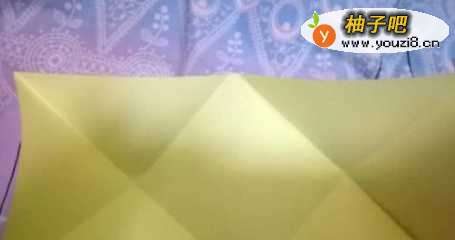 6之后我们将折纸翻面,在另一面将上面的边缘,向中心线对折,如图所示。