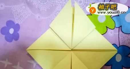4之后我们将上一步的两个三角形,上层的锐角向上折叠,并且和底下的中线以及边缘对齐即可,需要将四个锐角都折叠,如图所示。