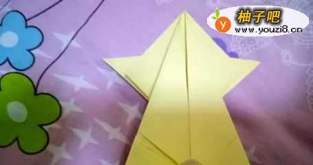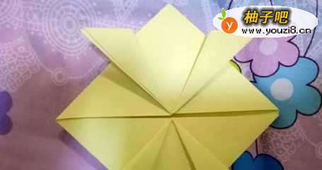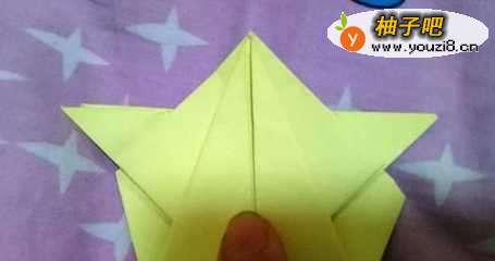 8之后我们将第六步折叠的纸,插入到第七步折纸的缝隙中,如图所示,这样青蛙的背部就固定好了。