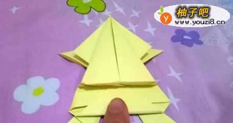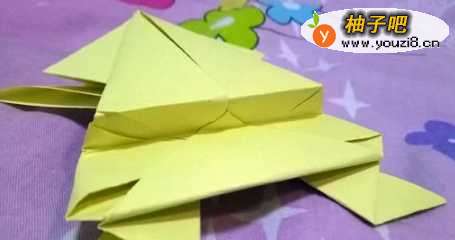 10之后我们再将身体上一步折叠的地方,后面一点位置,反向折叠,即可将会跳的青蛙折好,如图所示。大家按照这个方法图解,即可将会跳的青蛙折叠出来。