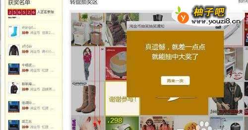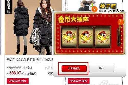 8图片开始滚动,当出现三个财神时,就表示您已经中奖了,获得该商品,只有两个图案相同时,可以获得少量的淘金币作为补偿