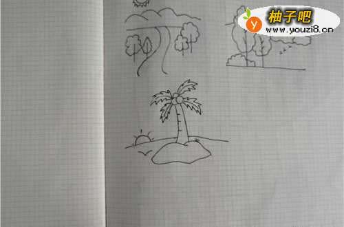 2接下来我们再画一幅,前面有两棵大树,后面有高山。