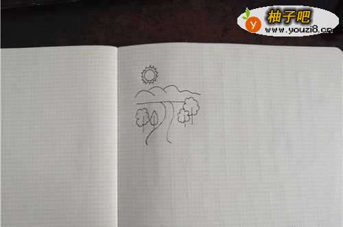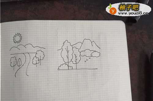 首先准备好绘画用具,我们先在纸上画一幅远山和小路,用最简单的线条描述最美的风景。