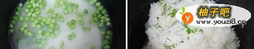 1、4人份的米洗好,放入适当的水,加少许盐,并将青豆一同放入,正常煮饭过程就可以.