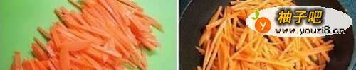 14、锅内放少许水,盐和糖,再放入胡罗卜丝翻炒.