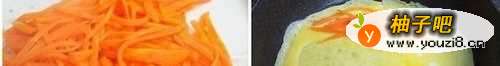 16、鸡蛋打散,蛋液内放少许盐调味.平底锅稍抹一曾油,倒入少许蛋液铺满整个锅底.如图放入炒好的胡罗卜丝.