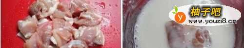 6、三大勺面粉与两大勺水调和均匀,将鸡肉放入面糊,是其均匀沾满面糊.