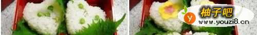 23、用心型模具做成4个饭团,当然也可以用其他形状的模具哦.然后下面掂上紫苏叶,摆放到便当盒里.