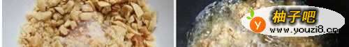 47、将坚果碾碎,放入沾有面糊的鸡肉,使其粘满碎坚果.