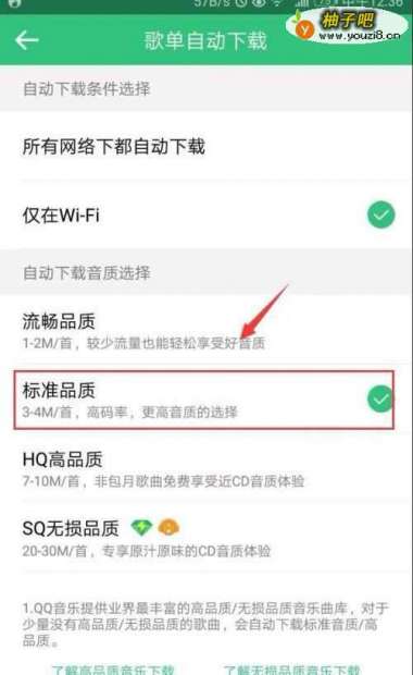 5来到了歌单自动下载界面,我们可以看到系统默认的是“标准品质”,如图所示。