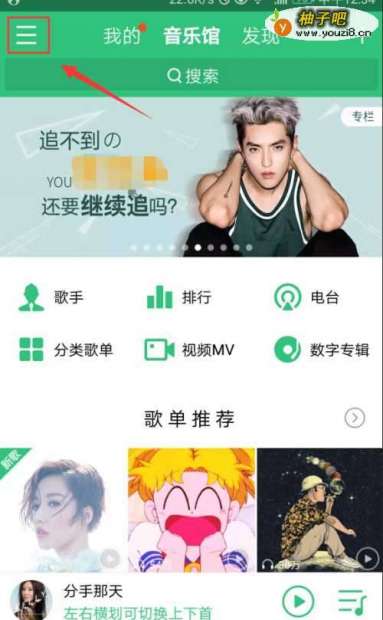2来到了音乐首页,我们点击左上方的三条白色线条,如图所示。