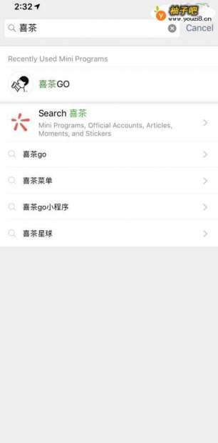 我们先在自己的微信,找到搜索框,在里面输入“喜茶”,就能找到喜茶的小程序了。