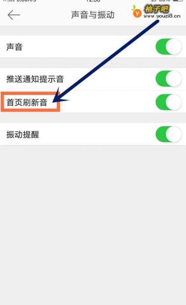 6在声音与振动功能中,点击关闭“首页刷新音”开关即可取消首页刷新时的提示音,如图所示