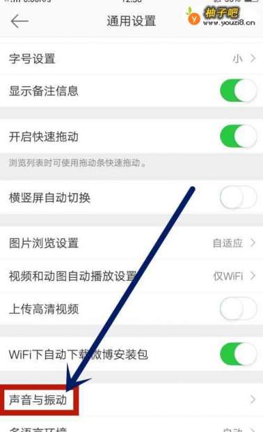 5进入微博通用设置后,下翻页面然后点击进入“声音与振动”功能,如图所示