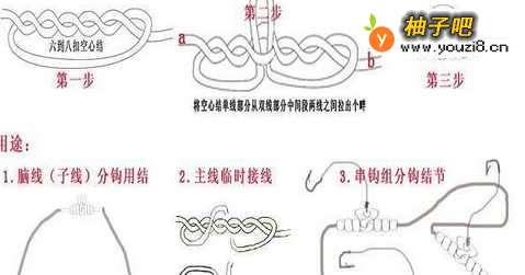 组装前选一段细软的空心塑料管,其粗细以仅能穿过钓线即可,先套在拴好钩的脑线上,脑线长出软管2厘米左右即可。组装时将套好软管的脑线与连接线并在一起,绾一死扣,而后用脑线的两端再结一死扣,这样拴既牢固,脑线在连接线上又不会移位。