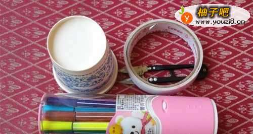 纸杯一个 手工纸两张 剪刀 双面胶 彩笔