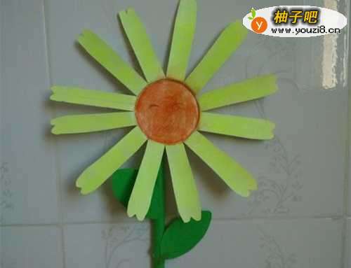 6再拿一张绿色纸卷成小棒子当花茎。