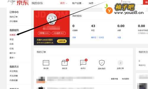 2在我的京东界面中,我们点击左侧的“优惠券”选项卡,切换至优惠券界面。