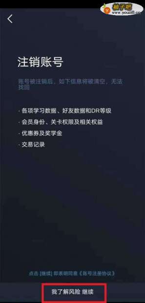 4阅读同意注销账号须知,点击了解风险确定注销。