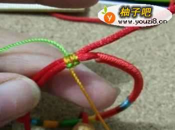 9将主线两头交叉,取一根五彩线用平结固定。