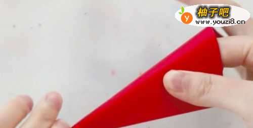 第一步,取出红色的卡纸,剪下了一小部分,做一个圆锥形的桶状
