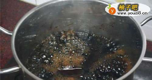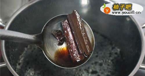 锅里加入350ml的酱油,150ml的清水,2片桂皮,4个八角,还有适量的砂糖,调味