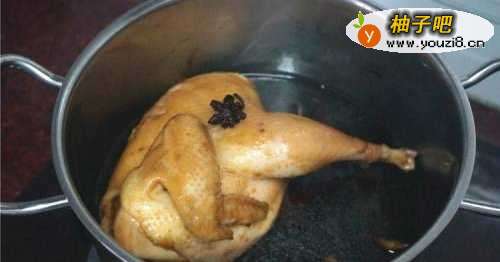 4由于鸡比较大,所有先浸泡一部分,盖锅浸泡,加快浸熟鸡肉