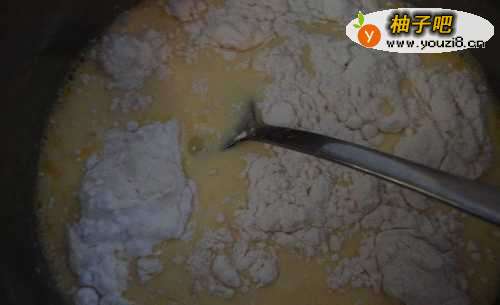 3低筋粉过筛后倒入锅中,搅匀,再过筛。