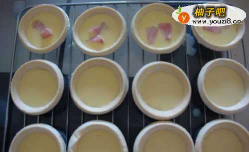 4将蛋挞皮摆在烤盘或者网子上,这里可以放些水果在里面,黄桃香蕉都可以,我放了写普通的桃肉,味道稍差,黄桃最好了。