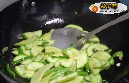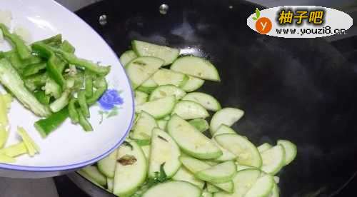 6将笋瓜翻炒顷刻后,放入青椒,翻炒