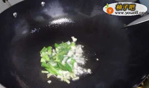 4待油6成热时,放入葱花、姜、蒜煸炒出香;