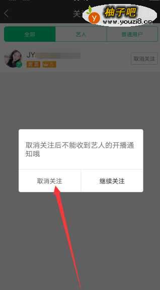 6弹出对话框,提醒是否要取消关注,点击取消关注,这样就完成了对主播的取消关注。