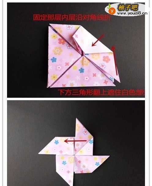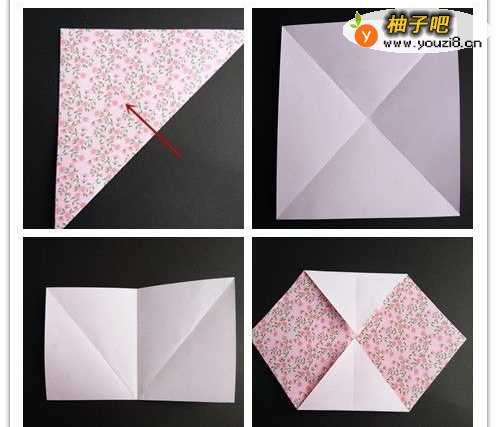 7将右边部分沿对角线往中间折叠,折叠后展开,里面一层沿刚刚折痕折叠,多出部分为小三角形往右折,下方三角形翻上去。四个角均如此操作。