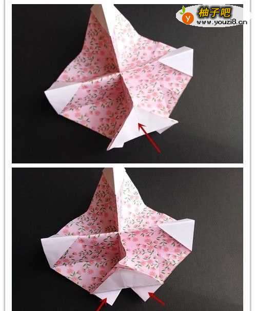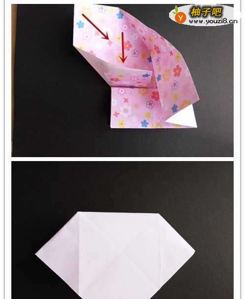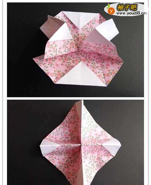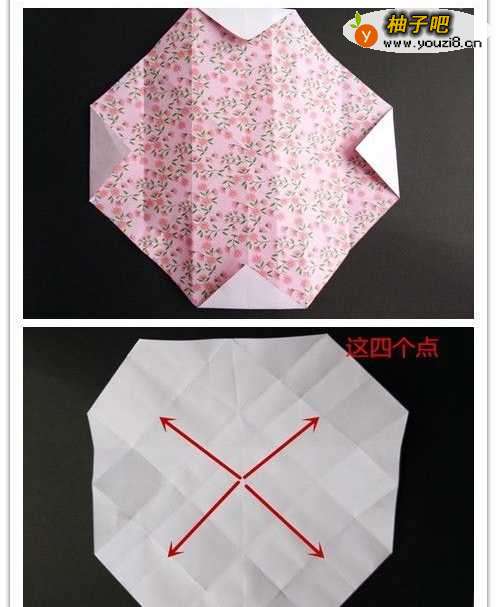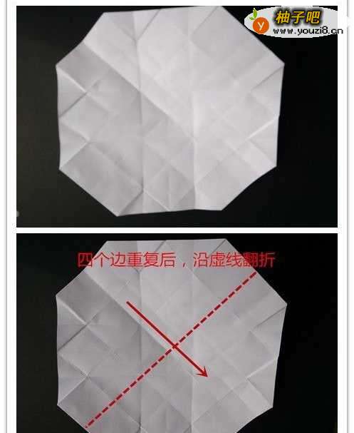 12将下边界的两顶点往图示的两点对折,折好后将重叠部分的左边往左,右边往右折。四个边均如此重复。