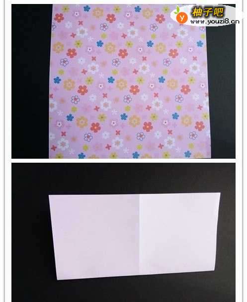 5沿中间竖线将上层往外翻折,左边沿中线往下翻折,左上角沿折痕向右翻折。折好如图,折好后往上打开,是四个小正方形。