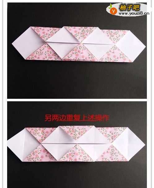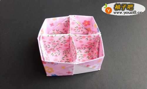16将纸背过来,多出的三角形部分往底面折叠,折好如图。将隔层放入之前的外面盒子即可,十字收纳盒制作完成。 实在看不懂描述,请注意看图哈。注意跟着小编的步骤来哦。