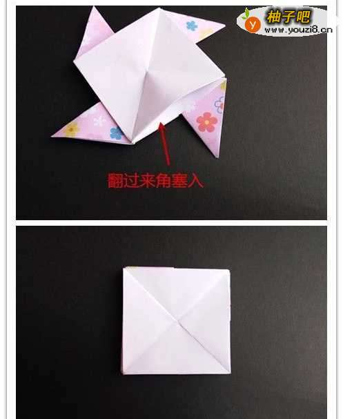 15将纸侧过来,沿三角形区域往内折入,将纸折叠,使多出的两个三角区域向侧插入,四个角均如此操作。隔层完成 。