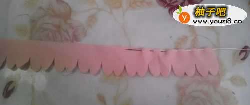 用针线把单边波浪花瓣条每隔4-5mm缝起来,做成一花球,如图所示