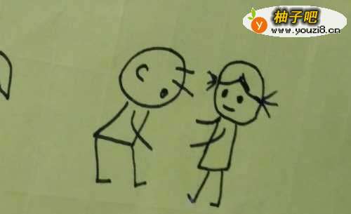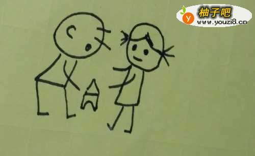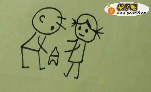 7然后我们再在两个小孩之间画上一个积木搭起来的宝塔就完成了。