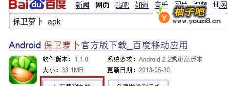 首先上百度搜索并下载相应的APK程序,例如小编在此搜索的“保卫萝卜”APK程序,在搜索结果页面中点击“下载到电脑”按钮。