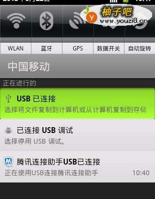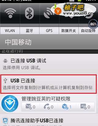 3拷贝APK到手机SD卡完成后,再次下获物拉手机状态栏,点击“USB已连接”,从打开的窗口中点击“关闭USB存储”按钮。
