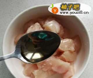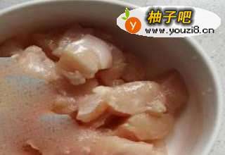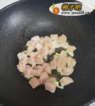 9锅中烧油,将腌制好的鸡胸块炒至变色。