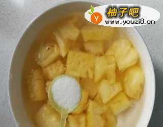 2菠萝切块,里面加水、盐浸泡半小时。