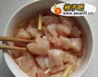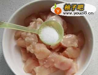 3鸡胸肉洗干净切成块,里面加盐。