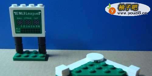2这里先找出一个棒球比赛的记分牌积木作为场景的背景,摆放的位置,如下图所示。
