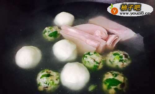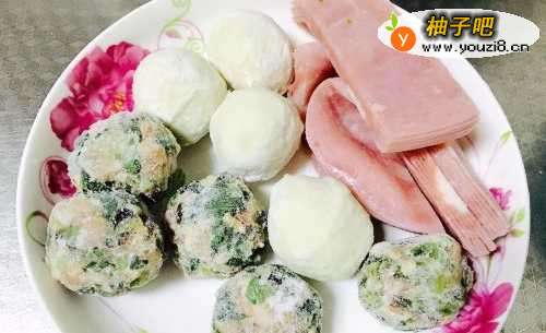 2接着把冰箱冷冻层的丸子拿出来,我这次放了5个肉丸,4个鱼丸和半包早餐吃剩下的美式火腿片。如果没有火腿片也可以忽略。