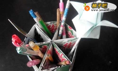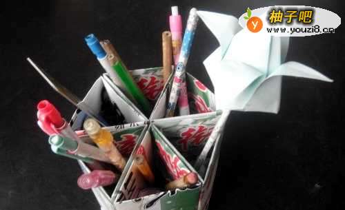 7同样的方法在折叠五个,用胶或者透明胶带粘贴一下,一个漂亮的笔筒就做好了,